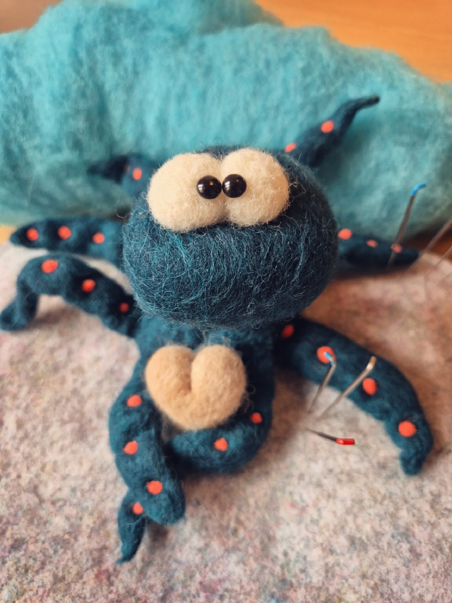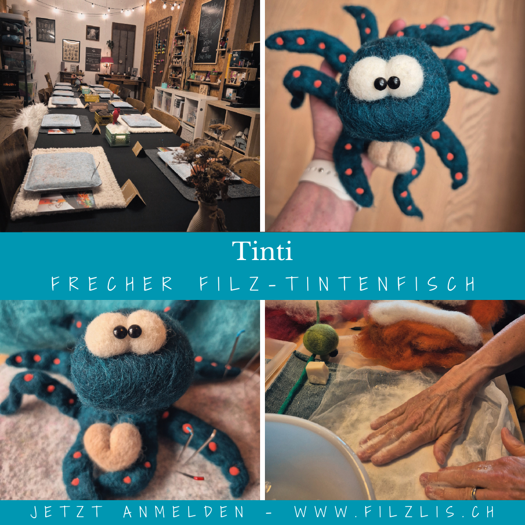 In diesem Workshop filzen wir „Tinti“ mit Nadel- und Nassfilztechnik – ein kleiner Kerl mit viel Charakter und kringeligen Tentakeln.