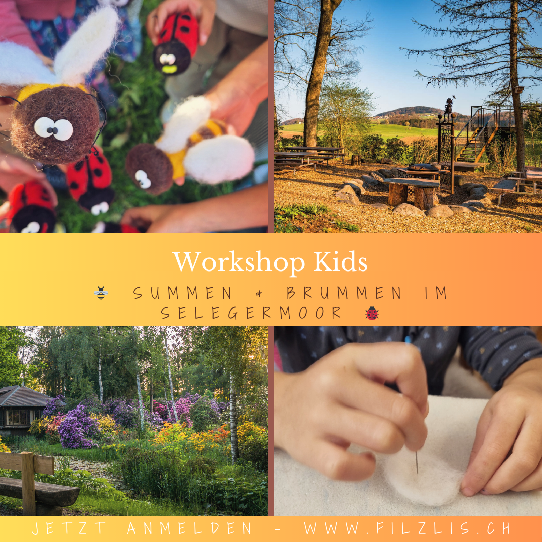 Mitten im wunderschönen Park Selegermoor lassen wir die Nadeln fliegen! Gemeinsam filzen wir bunte Bienen oder glücksbringende Marienkäfer. Unter Anleitung entstehen Schritt für Schritt deine eigenen kleinen Fluggesellen zum Mitnehmen und Liebhaben.